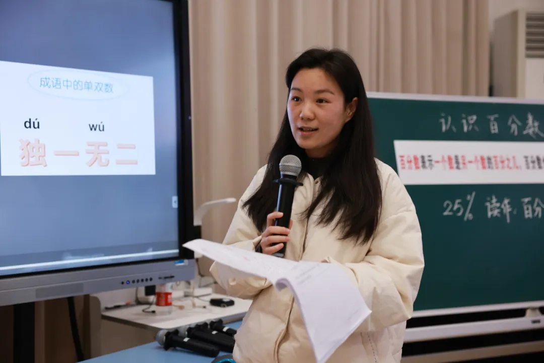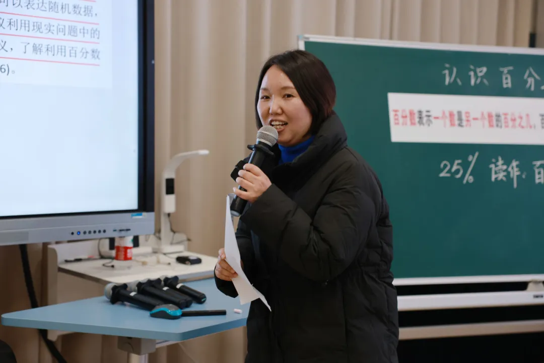 张新春老师进行了精彩的点评。他充分肯定熊老师在教学过程中注重运用直观经验认知世界,让学生尽情自主操作、亲身体验;盛赞李老师紧扣新课标变化,带领学生在丰富多彩的学习活动感悟百分数的统计意义。张老师还指出,我们的课堂应秉持“少则多,慢则快”的原则,即以“少”的教学内容留出“多”的学习空间,以“慢”的教学节奏带动“快”的思维发展,为数学课堂教学改革与发展指明了方向。