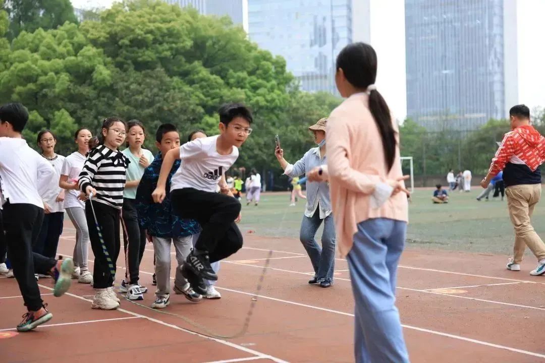 孩子们舞动着短绳,尽情地展示风采。他们挥动着双臂,画出了一道道美丽的弧线;他们跳跃着双脚,弹奏出一个个欢快的音符。行云流水的动作,展示着孩子们阳光健康的姿态;不断突破的成绩,展现出了孩子们艰苦训练的丰硕成果。