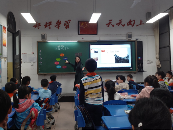 第一堂由彭老师执教二年级下册课文《传统节曰》。首先她让学生介绍自己熟悉的传统节日的方式导入课题,然后请学生按时间给节日卡片排序并带读,充分调动了学生的学习积极性,为本课主题创设了情境。在接下来的识字环节,彭老师还运用了“识字开花”“字源识字”“猜字谜”等多种形式,让学生在轻松愉快地氛围中,识记了生字。