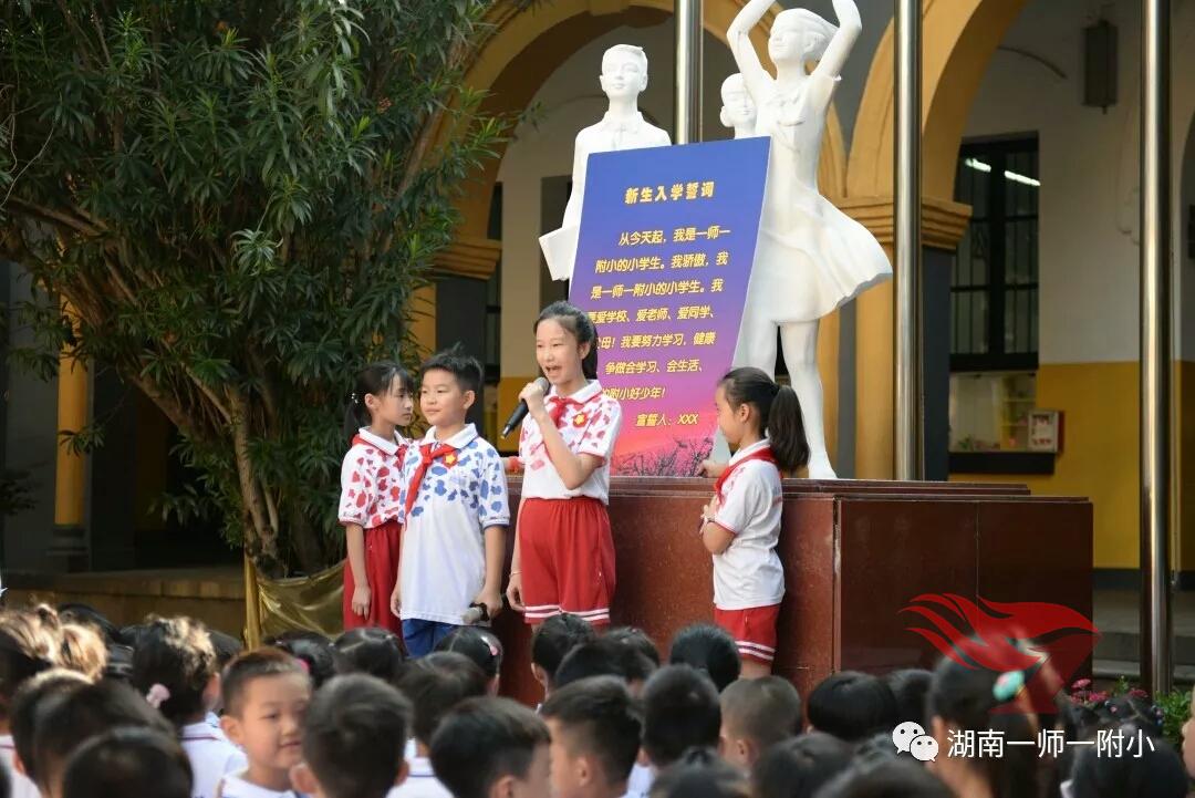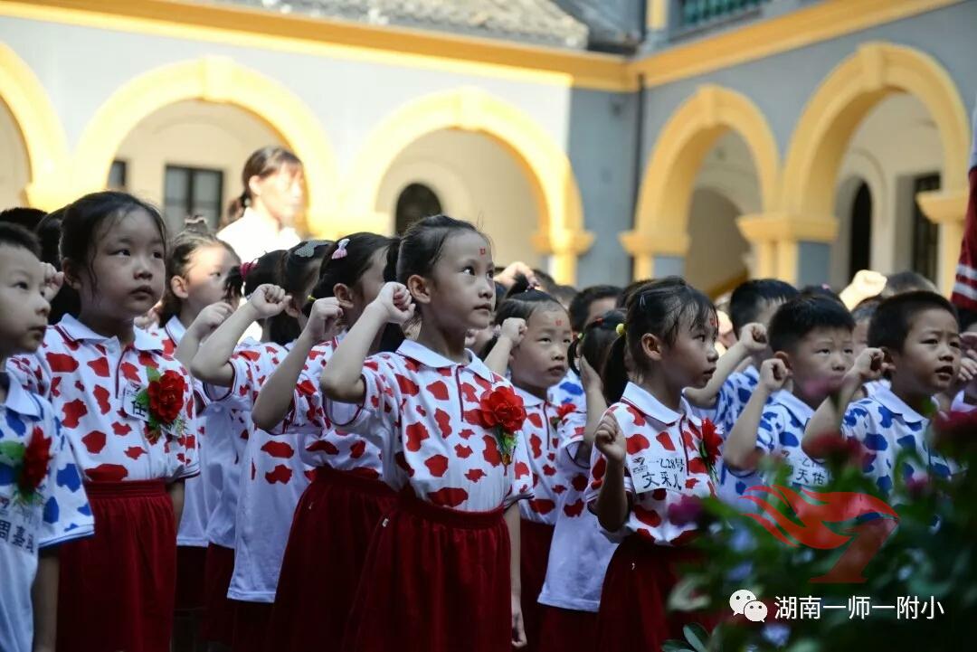 朗朗金秋,静默许久的附小庭院芳色满园。9月3日清晨8时许,湖南一师一附小2018年下学期开学典礼暨新生入学仪式在大操场隆重举行,附小全体师生佩戴亲手制作的抗战胜利花,翘首以待,共赴一场新学期的盛宴。