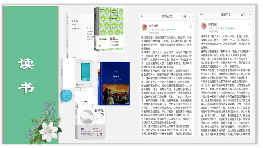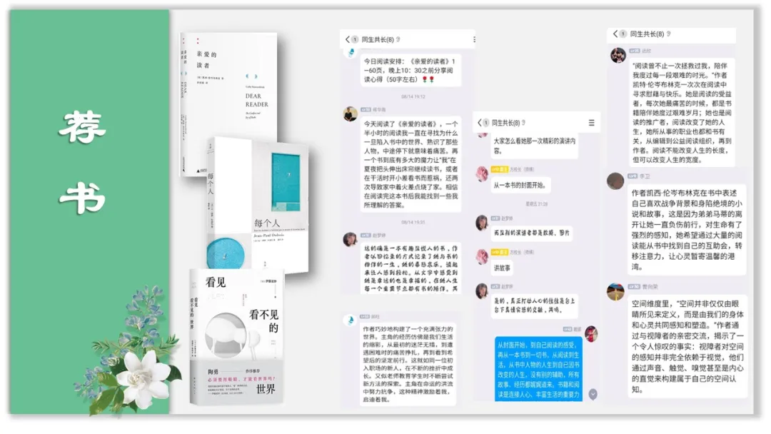 荐书:分享智慧,共促成长。暑假期间,方校长精心挑选书籍,组织开展了线上共读活动,旨在构建一个深度学习与智慧共享的教师学习共同体。在共读的时光里,老师们不仅跨越了知识的边界,深化了阅读的层次,更在思想的交流碰撞中,发现了彼此独特的阅读视角,激发了深邃的思考与心灵的共鸣,促进了个人与团队的共同进步。正如方校长在新学期寄语中所期待的:我们向外看,看人,看事,看天地,不断拓宽视野,走向更丰富的缤纷世界;我们向内求,读书,写作,增内力,不断敞开自我,构建更丰厚的精神家园。