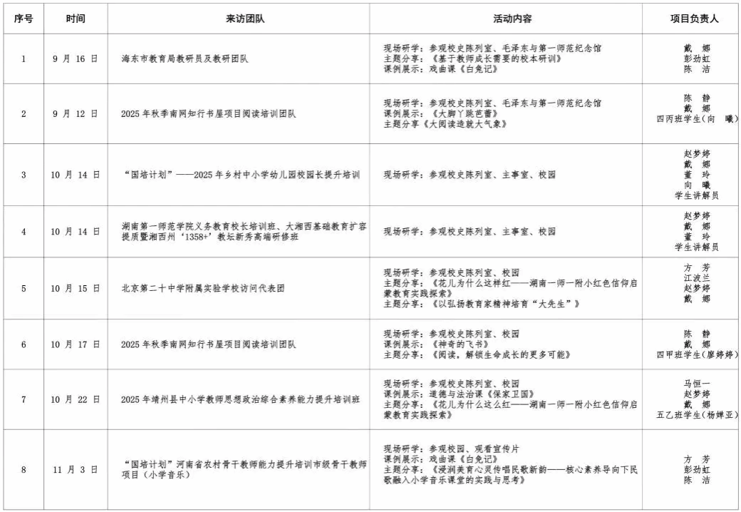 “有朋自远方来,不亦乐乎。” 正值秋意盎然、硕果盈枝的美好时节,我校作为教育部国培计划实践基地与湖南省中小学教师培训基地,于9月至10月间,先后迎来北京、青海、河南、湖南等地共8批次、500余人到校交流学习。在秋日的附小校园里,一场场思想碰撞接连上演,一次次经验交融不断发生,正共同织就跨区域教育共生共长的活力经纬。