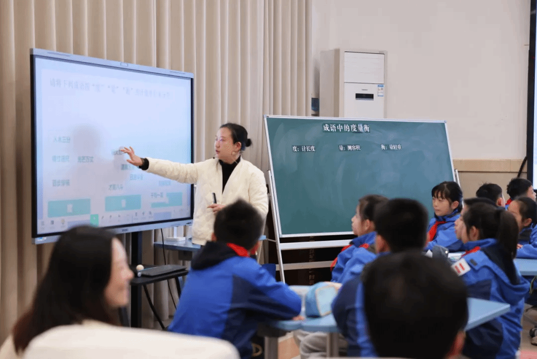 刘擎擎老师以《成语中的度量衡》搭建跨学科桥梁,将成语、计量、历史文化深度融合:课堂以猜谜趣味导入,引导学生分类梳理“度、量、衡”相关成语,随后聚焦“千钧一发”展开核心探究,带领学生解锁古今计量单位换算逻辑,通过小组合作完成研究报告;汇报交流环节,学生以数学视角拆解成语中的计量内涵,课堂同步穿插历史背景视频补充文化语境,让学生在趣味实践中既深化量感认知、增强知识应用意识,又建立对成语背后文化底蕴的认同,最终实现学科融合与核心素养的双重提升。