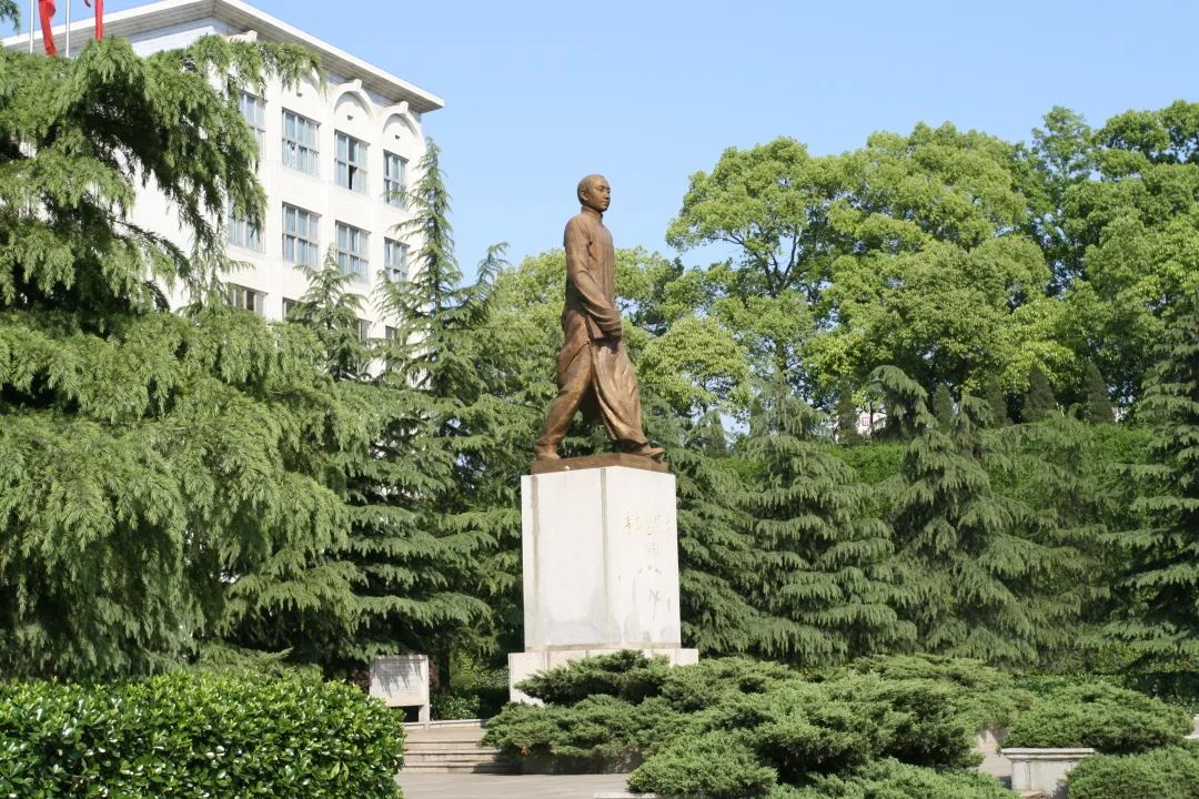 在我们第一师范校园的体育场前,矗立着一尊巨型青年毛泽东铜像。这尊铜像是学校为纪念伟大校友毛泽东主席诞辰100周年而建造的。