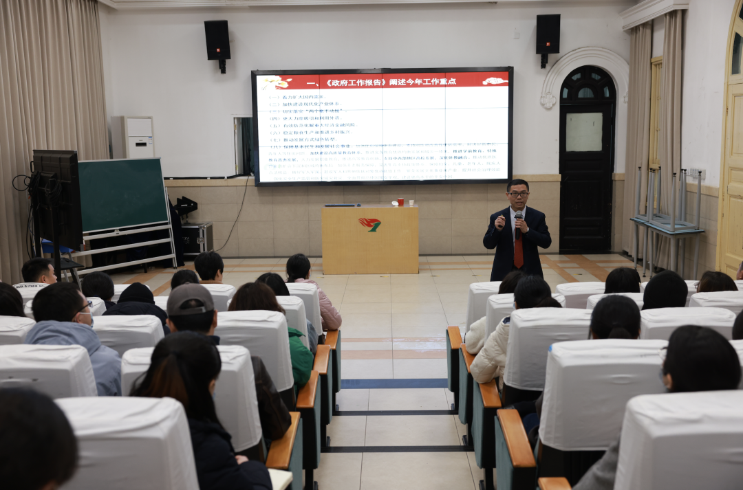 接着他深入浅出地解读了全国“两会”精神,从《政府工作报告》中系统梳理了全国“两会”对教育的部署要求,诠释了新时代教育事业的责任与使命。同时,以多位人大代表与政协委员提案中的观点勉励全体党员教师要永葆敢闯敢干、努力拼搏的奋斗精神。