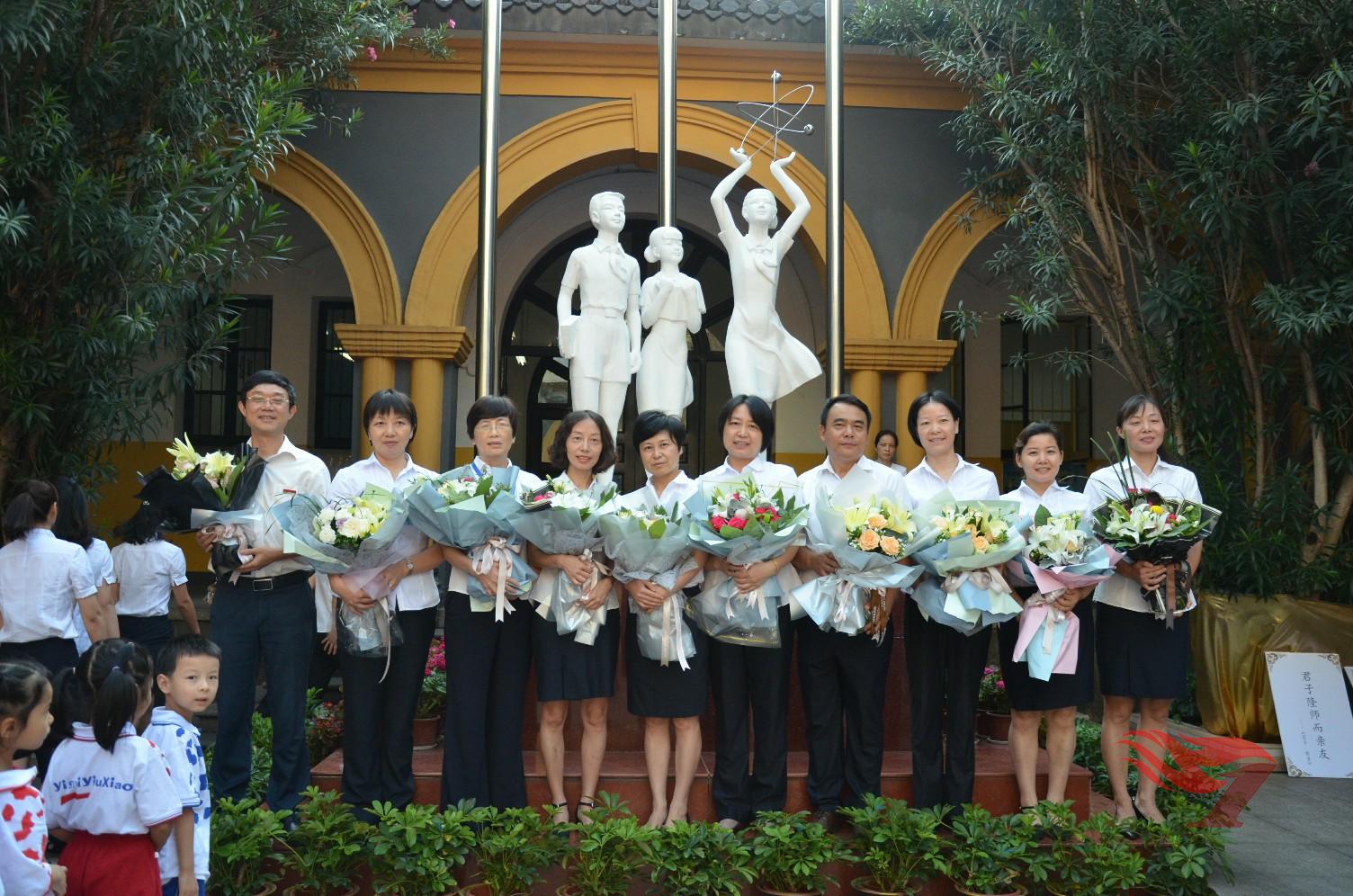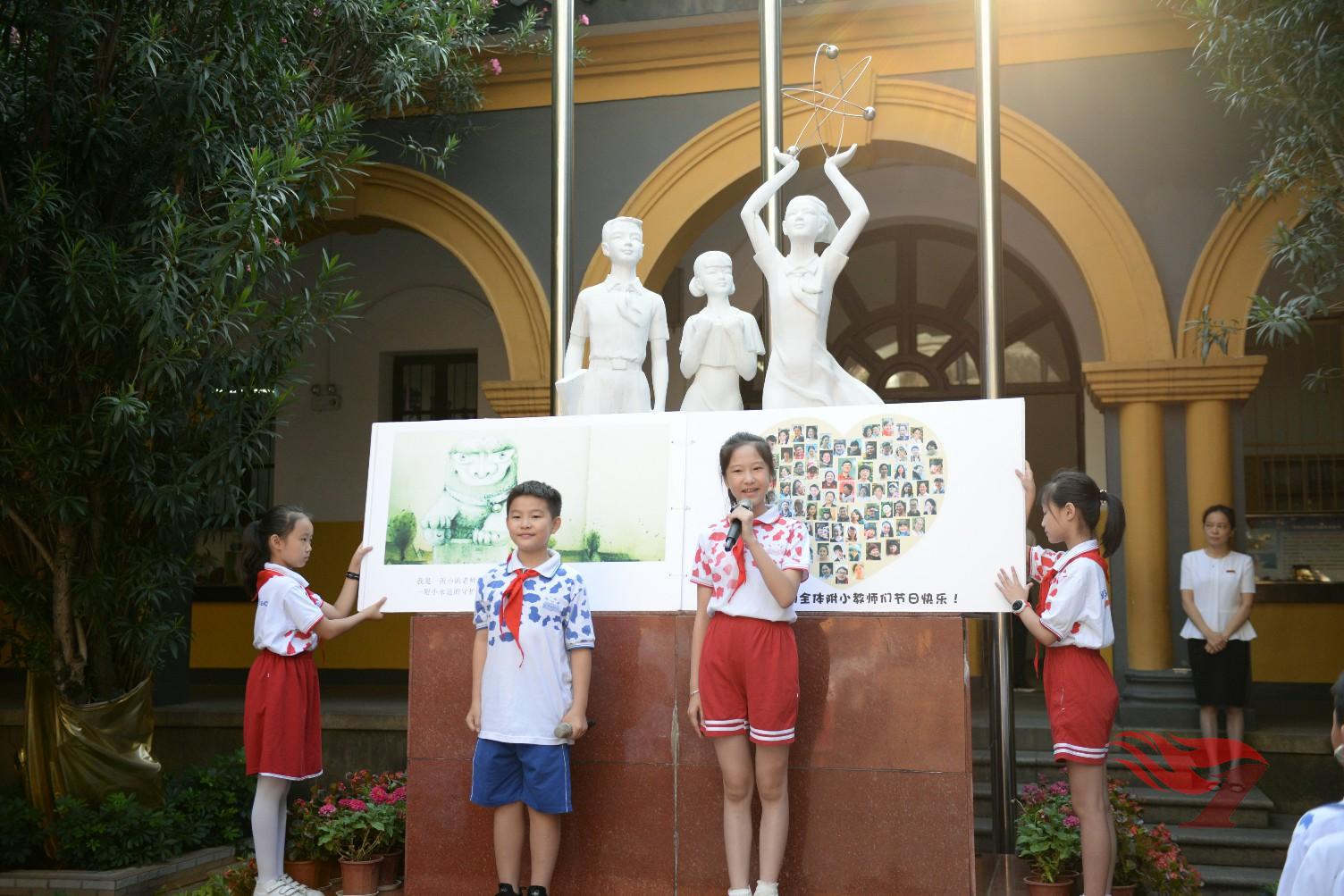 颂师恩。升旗仪式之后,是百舸学院弟子们带来的“中华文明礼仪课堂”,他们用童声稚语解读尊师重教的传统美德。接下来,是张涵予同学娓娓讲述着我校2017届毕业生徐凤妮同学改编的《小石狮》,它道尽了每一个附小老师心中的情怀——“我是一附小的老师,我是一附小的守护神,永远的守护神”。每一位附小的老师,都在守护着附小的寒来暑往,守护着一届届学子的成长成才。尤其是那些从教近三十年的资深教师们,三十年的青春与热血,三十年的奉献与坚守,有你们,附小的后来者才有方向,有你们,附小这个大家庭才更有力量。当附小的年轻教师们向十位资深教师代表献上节日的鲜花,当学生们亲眼见证这一时刻,眼中饱含着感动的热泪。当余运群副校长言辞恳切地说出自己这三十年的点滴感动与满满幸福,教师节不再只是一个节日,更是一种精神的引领与文化的熏陶,是附小师生共同传递的美好。