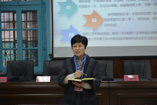 董玲老师认真解读了综合教研组新学期工作计划,并从课堂常规、课程建设、团队打造三方面详细介绍了本学期具体的工作设想。根据综合教研组“学科范围广、跨班教学多、教师年轻化”的特点,本年度将以“创规范有质的综合课堂”、“依托课题的课程探索”、“同生共长的团队建设”为发展目标,全力打造学习型、研究型、团结型的教学研究团队。