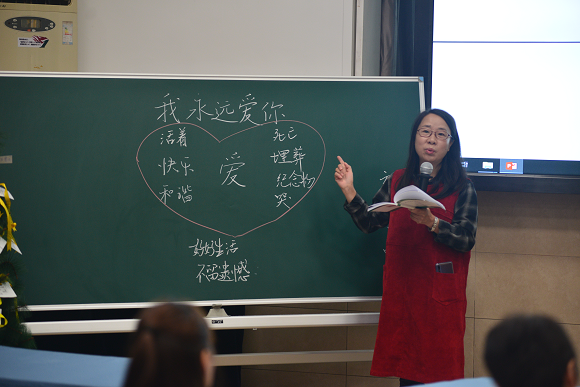 在课程设计中,刘老师以“生命协奏曲”作为热身游戏导入,游戏过程中,学生充分体会到生命是一个循序渐进,是一个循环的过程。接着,刘老师重点引用了绘本故事《我永远爱你》,通过精短的故事,巧妙地打开了关于死亡的话题。气氛刚好,刘老师抓准时机,以温和地、亲柔地叙述方式,与学生分享起亲身经历或亲人分离的故事,不知是音乐的渲染,还是故事直戳到了人们的柔软之处,在场所有人感动不已,甚至落泪。孩子们就这样回忆着、交流着、理解着,面对死亡,我们无法回避,只能勇敢面对。刘老师也不断地与孩子们强调:希望同学们可以更好地活着,用力地活着,过好当下的每一天!