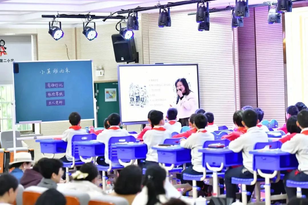 上半场的活动共呈现了三堂精彩的“整本书阅读”示范课。我校陈静老师执教的是四年级下册《小英雄雨来》整本书导读课。这是一本反映革命传统,表现英雄模范事迹的红色励志读本。为激发学生的阅读兴趣,陈老师巧用目录中的小标题,和学生一起围绕着“有趣好玩”的、“惊险紧张”的、“出人意料”的情节展开预测。陈老师的巧思妙引激活了学生的想象力,孩子们带着感兴趣的话题一边读,一边猜,完全沉浸在雨来的成长故事中,兴致盎然的状态也感染了全场教师,台上台下笑声连连,掌声阵阵。