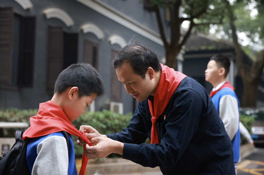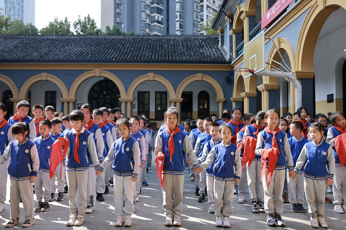 六年级队员为五年级队员佩戴大领巾。一条红领巾,牵系的是附小少先队大家庭的温暖与情谊。“强国有我”的铿锵誓言诉说着附小少年逐梦未来的坚定信念。
