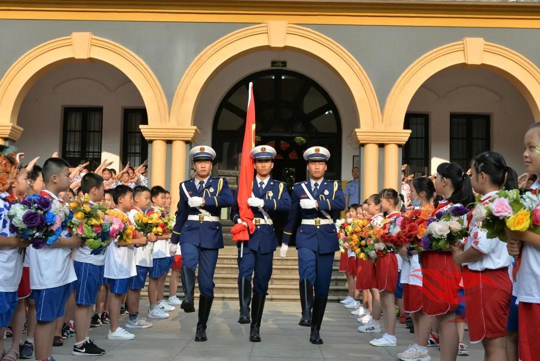 伴着庄严乐声,映着鲜花领巾,迎着晨曦旭日,长沙市消防救援支队特勤大队的战士迈着铿锵有力的步伐,护送新学期第一面国旗入场,正式扬起了新学期起航的第一面风帆。