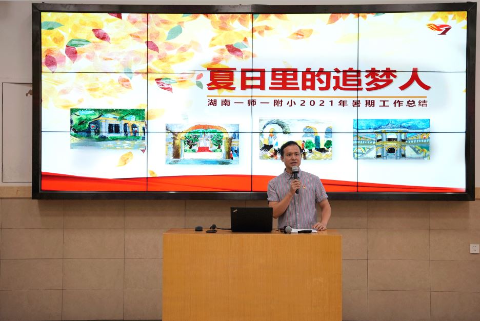 梦想的实现,永远都在追梦人的脚步里。观看了先导片后,副校长潘勇以“夏日里的追梦人”为主题从“规范办学促发展、硬件改造提品质、疫情防控保安全、课题成果树品牌、童画童心筑童梦、筹备开学追梦行”几个方面总结了暑假各工作。40多天假期,校园在一群忙碌的身影中悄然地变化着。行政在场,教师在线,每一个细节,每一份努力都在诠释附小人对品质的追求,对师生幸福生活的牵挂。这一群夏日里的追梦人,正在一点点地在践行着构建附小未来校园的梦想。