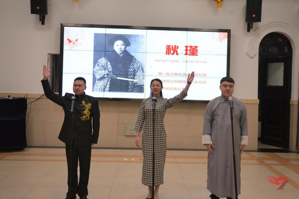 一百多年前的中国,在帝国主义和封建主义的双重压迫下,中华民族承受着巨大的屈辱和灾难,人民生活在水深火热之中,国家濒临灭亡,一百多年前,革命成为时代潮流,一批又一批革命党人为了心中的信念献出了自己的青春和生命,其中就有这样一位女性,她是第一批为推翻满清政权和数千年封建统治而牺牲的革命先驱,也是在中国近代史上第一位为革命而牺牲的中国女性。她在临死前说道:“我此番赴死,是为革命,中国妇女还没有为革命流过血,当从我秋瑾开始。纵使世人并不尽知革命为何,竟让我狠心抛家弃子,我此番赴死,正为回答革命为何事。”活动中,品社组马恒一老师、科信组贺娇娜老师和书法老师易万喜通过演绎经典朗诵作品《秋瑾》,向队员们诠释了——革命是为我们有一个风雨不侵的家,为我们有一个强大富兴的国。