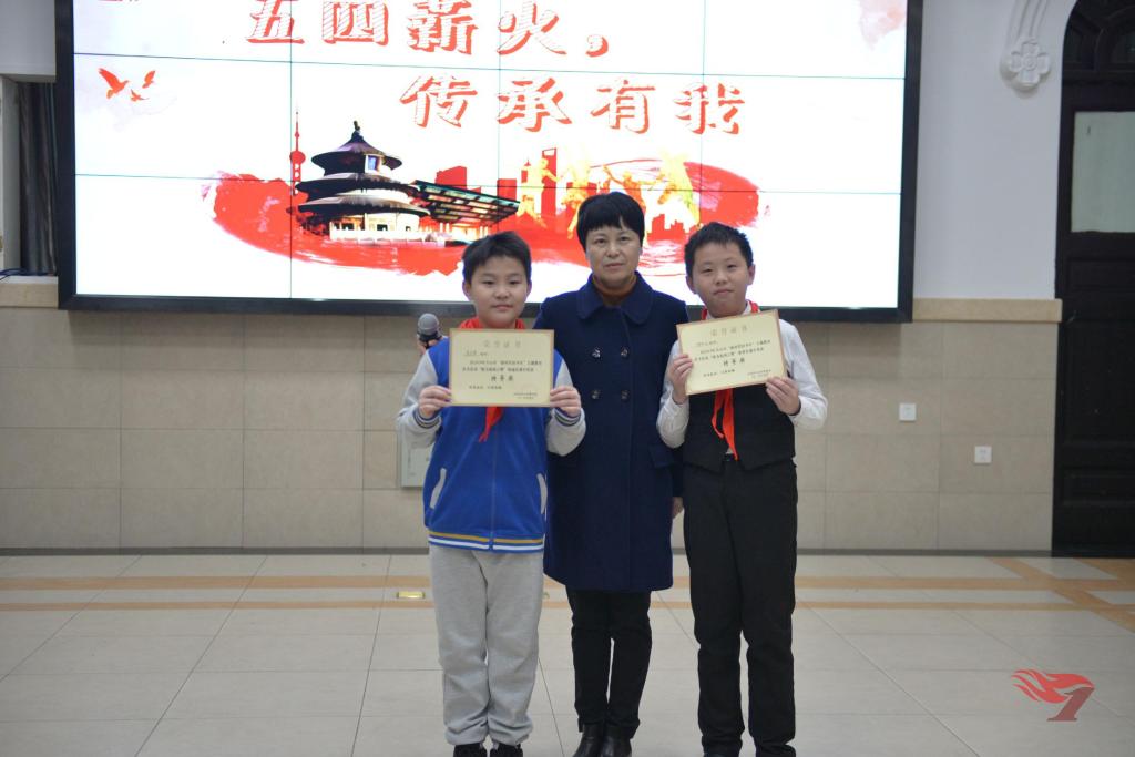 为纪念“五四”运动一百周年,为迎接祖国70华诞,我们以队会、演讲、朗诵、征文、小报等方式表达对祖国的无限热爱,在这一系列的活动中,同学们收获了幸福,收获了成长,也收获了硕果。在今天的主题活动中,副校长江波兰为在2019年天心区新时代好少年主题教育活动 “我为祖国点赞”朗诵和演讲比赛中获得特等奖的李东哲、胡亦汉两位同学进行了表彰。