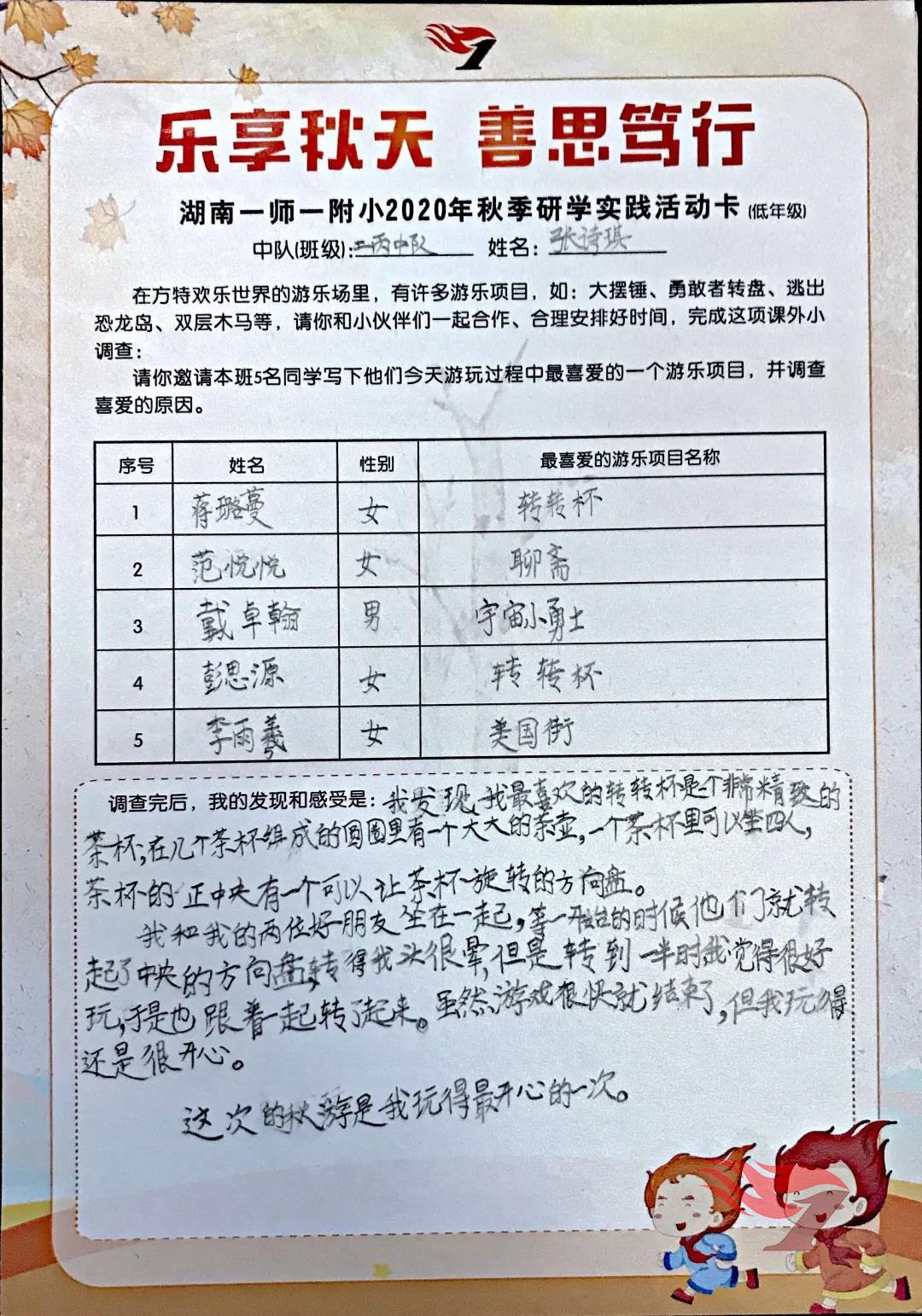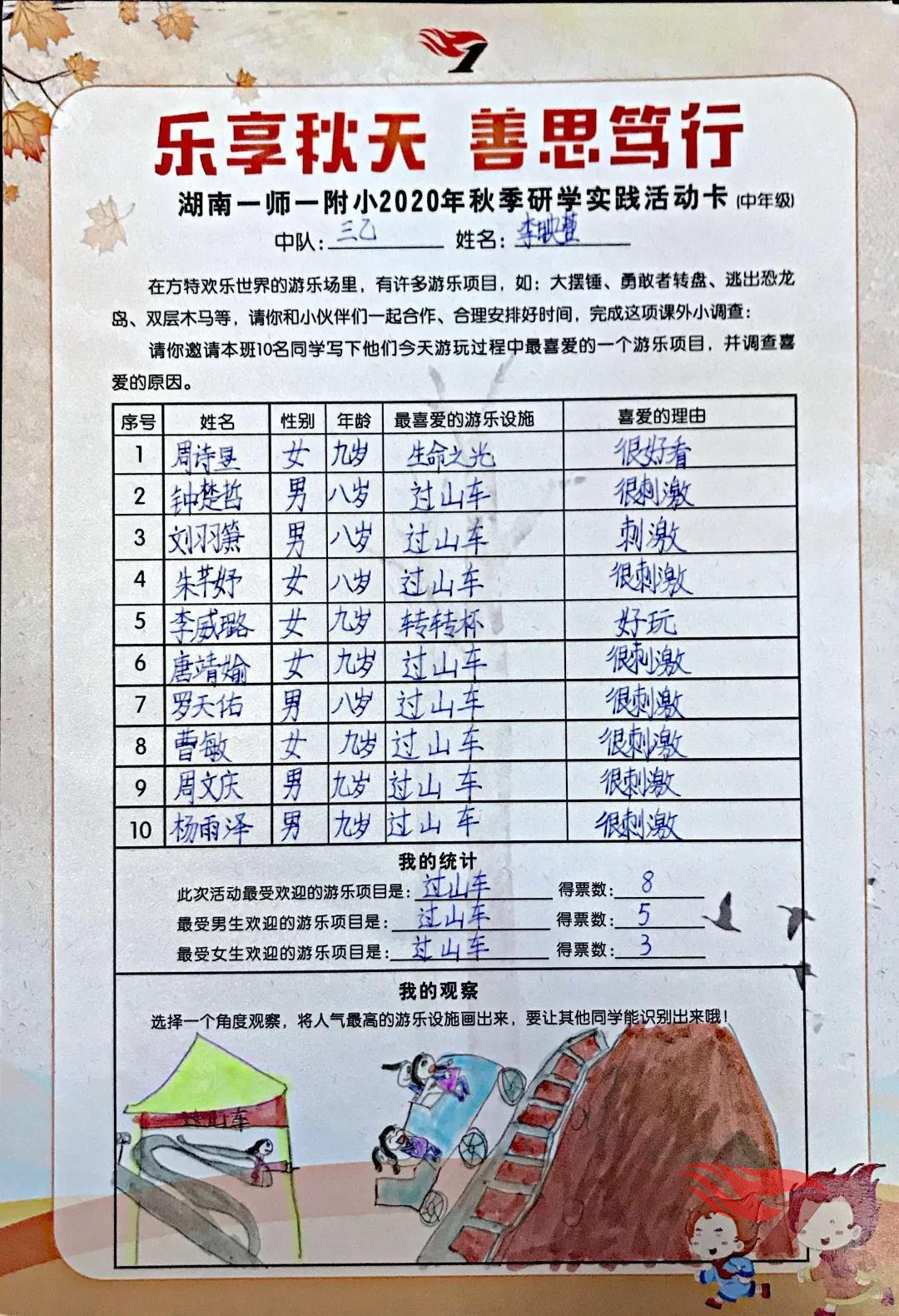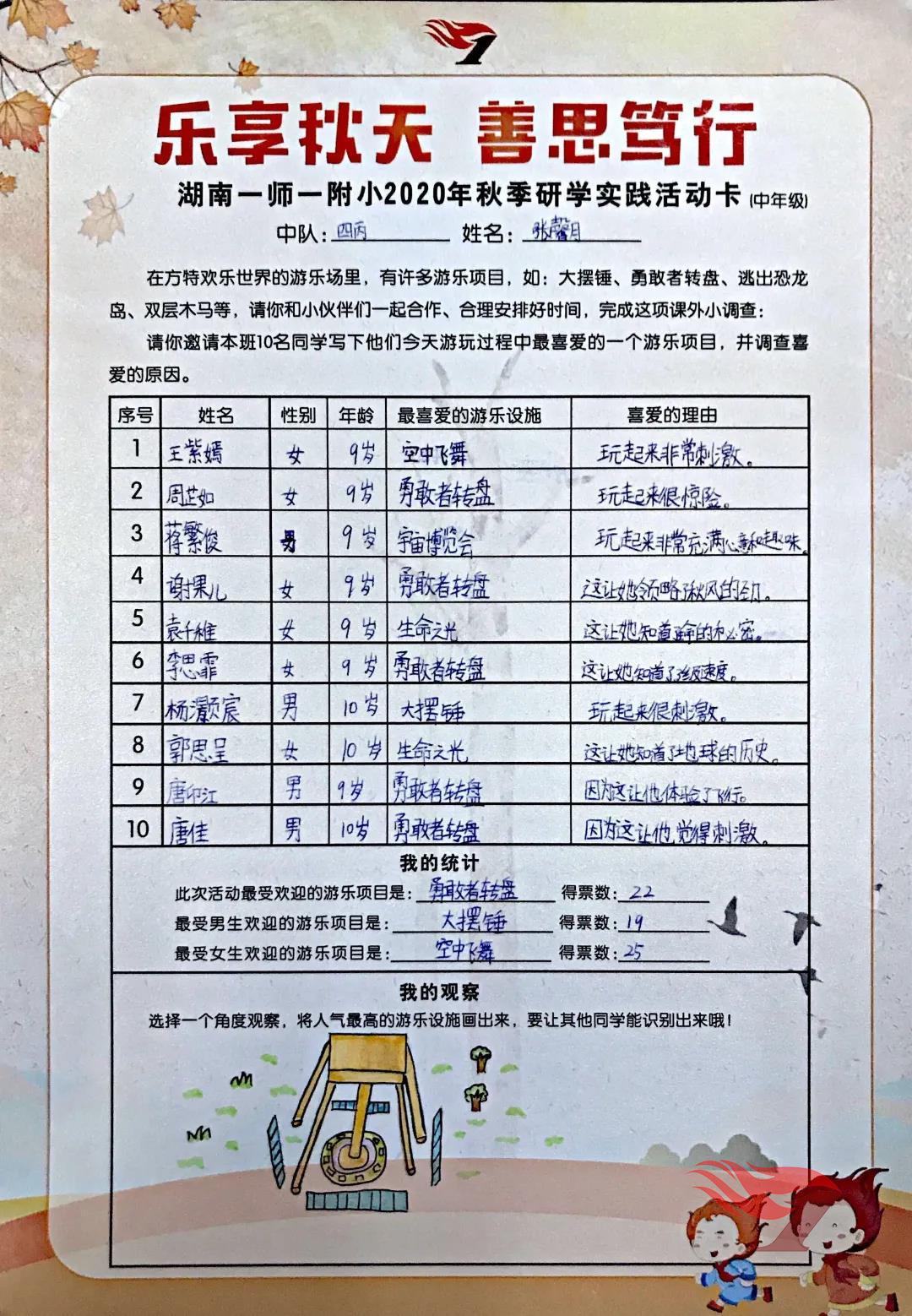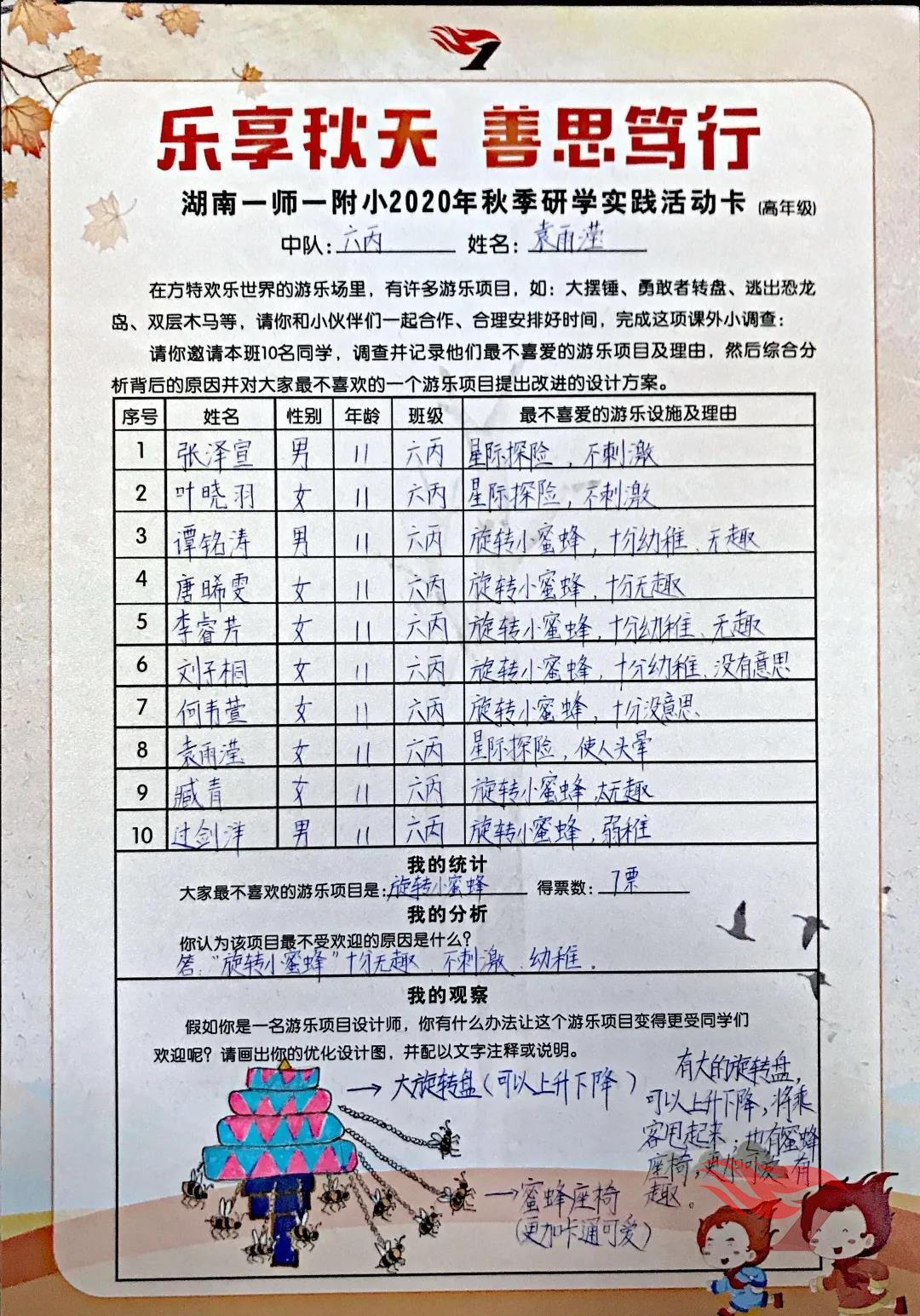此次研学活动,孩子们带着问题、带着任务出发。玩中学,乐中思。做中行。低年级的孩子增进合作、学会沟通,了解并记录伙伴们最喜爱的游乐项目。中年级孩子以小队为单位,分别统计游乐场里最受男生、女生欢迎的人气项目,通过直观比较分析不同。高年级学生则进一步调查伙伴最不喜爱的游乐设施,并尝试学做一名设计师,为该项目提出自己的改进优化方案。调查——分析——研究——解决,孩子们观察着、思考着、实践着。一张张研学卡上记录下孩子们丰硕的劳动成果、迸发的智慧火花。这也是附小为培养学生探究精神,夯实学科知识纹理,提升立体思维品质,开发特色研学课程的又一尝试。