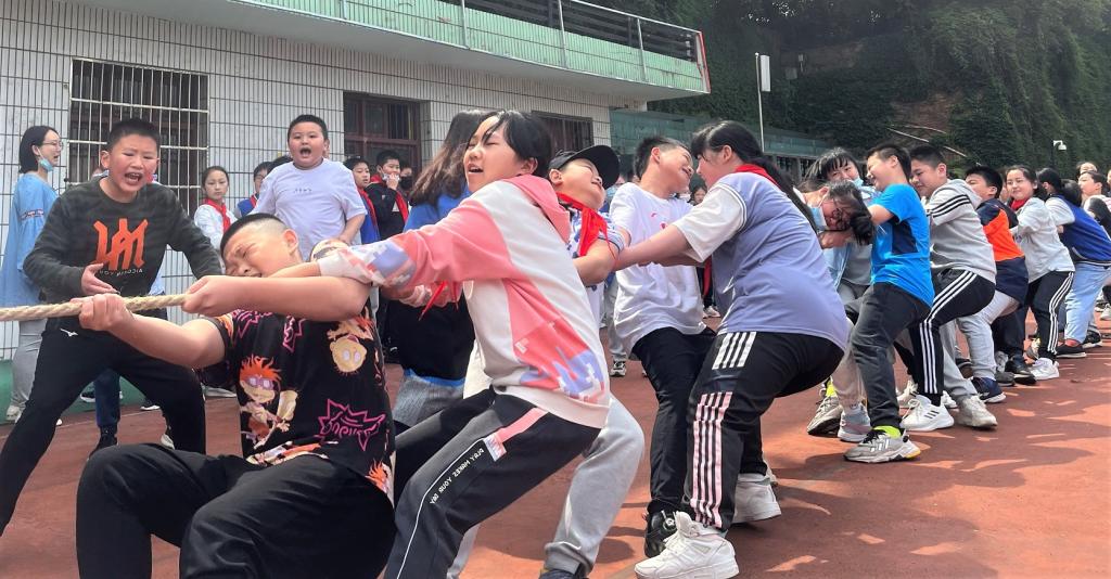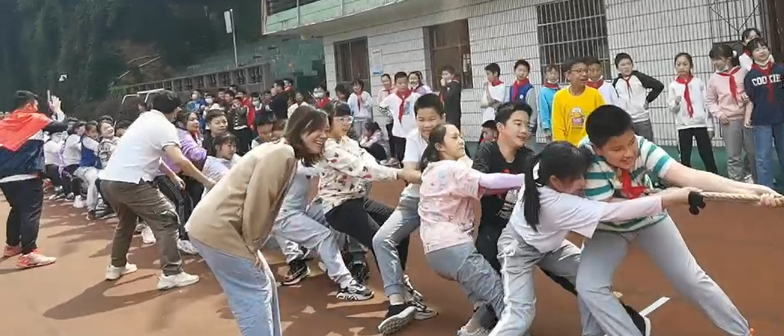 拔河比赛哨声一响,大家都死死地攥紧绳子,双脚恨不得深深地钉进地里,眼睛瞪得滚圆,脸憋得通红。绳子中间的指示标记一会儿往左、一会儿向右,场外师生们的呐喊、助威声震耳欲聋。随着比赛的结束,有的欣喜若狂,有的不甘示弱,还有的泪水涟涟,这就是体育运动的乐趣吧!
