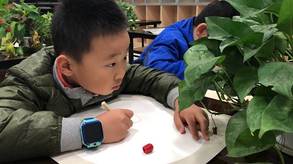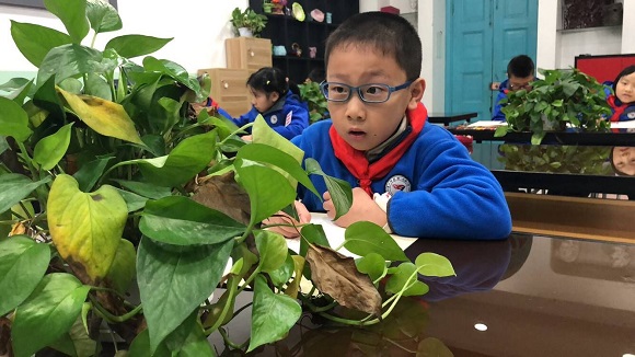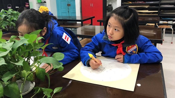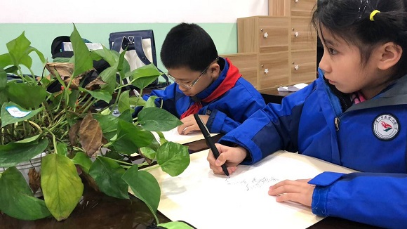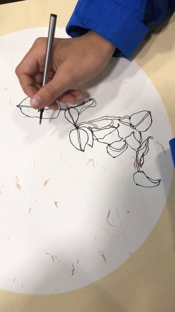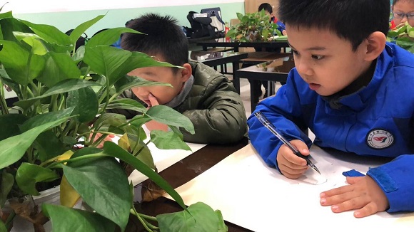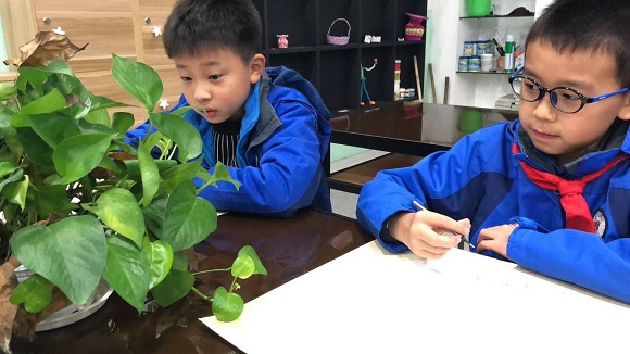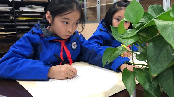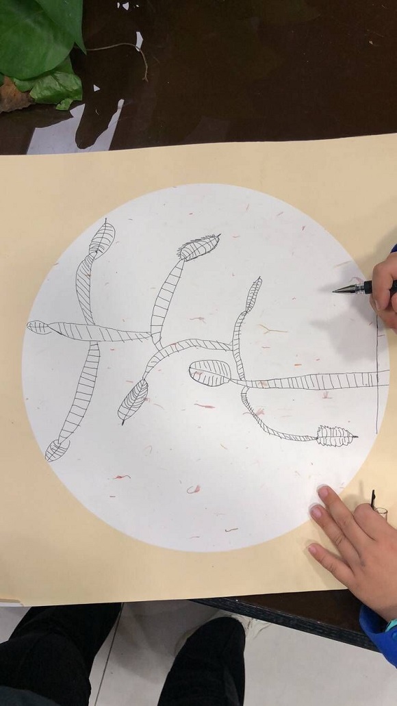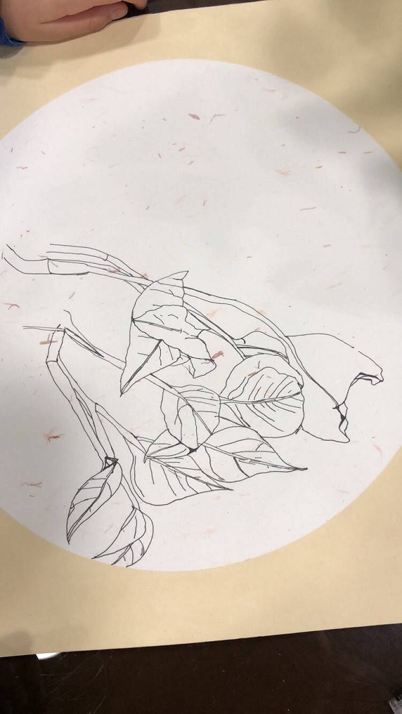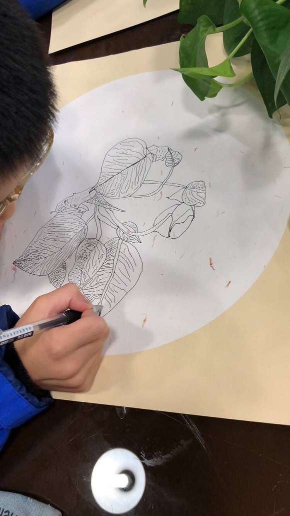 面对繁杂的植物叶片,处处是生机,孩子需要学会手随眼动,学会取舍,对于质感,形态,要善于观察,直面真实景物。
