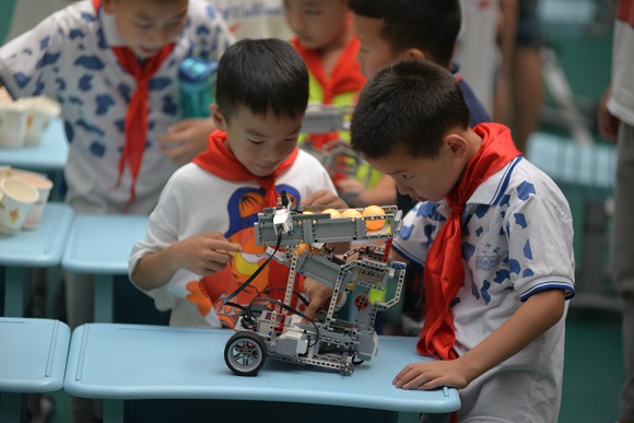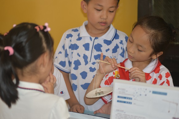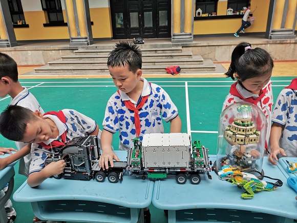 在科技体验活动中,学校集科技社团之力,布置了3个展区,共同为孩子们营造了一次学习、游乐与体验之旅。其中A区为科技与生活社团作品展示区,以孩子们平时的制作作品为主,由四年级学生制作相关手抄报呈现步骤与材料,二年级学生进行演示与介绍;B区为科技类社团活动体验区,二年级科技与生活社团、中年级模型社团的孩子们齐上阵,航天模型、自制排箫、水果电池、气球火箭,“放飞”、“吹响”、“点亮”……带领前来体验的同学们共同探究、一起成长;C区为乐高机器人项目体验区,精致的机械结构——天空之城,酷炫的车迷世界——奔驰翻斗车、马克大货车、F1赛车整齐陈列,以按压传感器控制的跑步比赛和机器人投篮赛两个互动活动将体验区的气氛推向了最高潮。