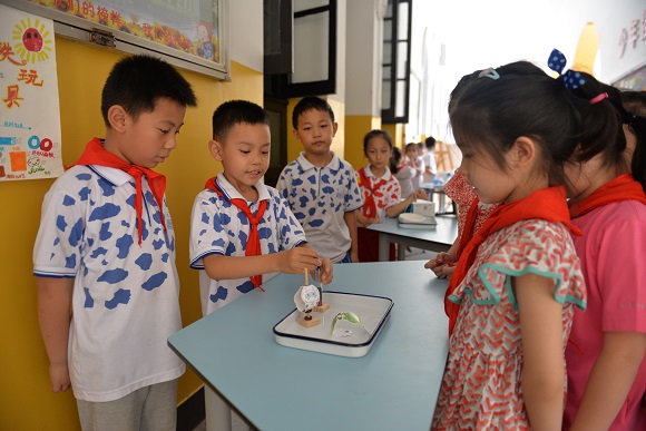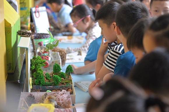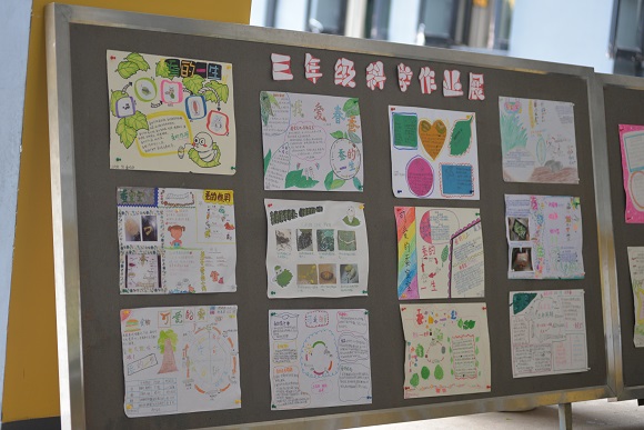 校园里还同时展示了由《小学低段科学课外实践活动研究》微课题引领下的系列作业。一年级科学作业展——“给动物建个家”,作品创意十足,承载了孩子们心中对生命、对生态一点一点的认识与期待;三年级科学作业展——“养蚕”,每一幅手抄小报都精心描绘,有观察、有记录、有科普、有感悟。