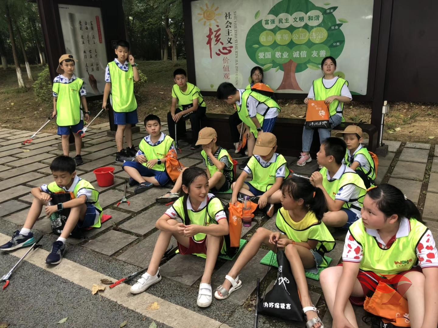 7月18日下午2:30,五乙中队吕嘉懿、龙飞、陈佩霖等11位同学聚集在洋湖湿地科普馆,参加“无痕洋湖”垃圾分类社会实践活动。