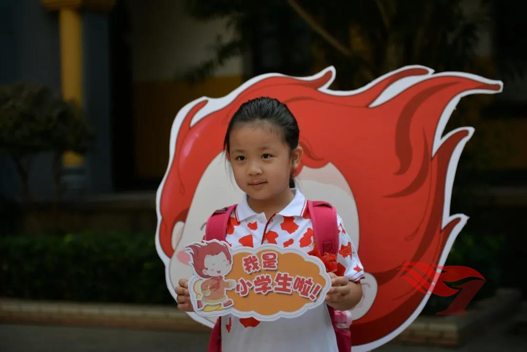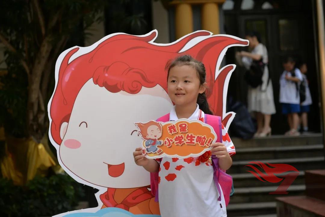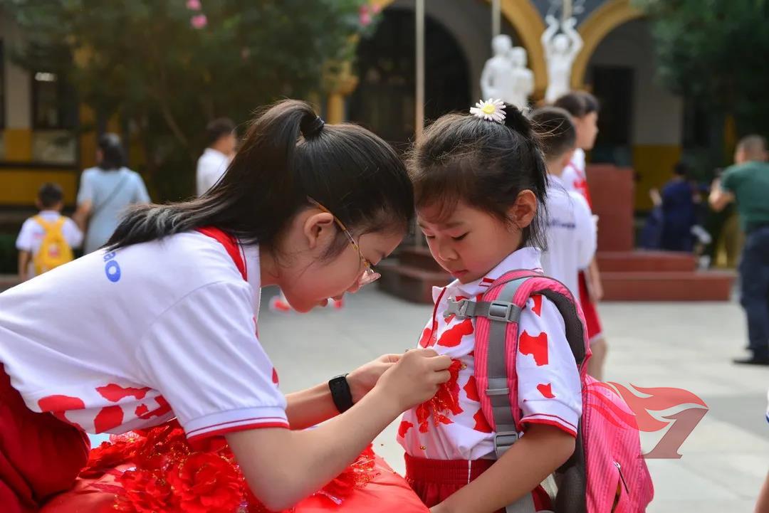 瞧!操场上,亲爱的校长、可爱的礼仪队哥哥姐姐正在给孩子们佩戴鲜艳的红花,夹竹桃下,附小吉祥物峥峥、嵘嵘欢喜地等待着新伙伴。快,带着爸爸妈妈,欢喜地和峥峥嵘嵘合影留念吧。这是成为光荣附小娃的第一张珍贵照片!