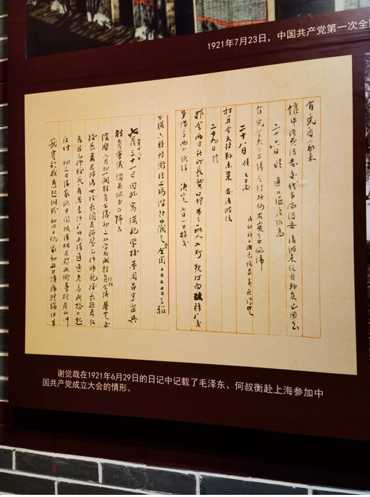 在第一师范的校史陈列室里有一则写于1921年6月29日的日记摘要,记载了毛泽东、何叔衡赴上海参加中国共产党成立大会的情形。这则日记就出自于谢觉哉。