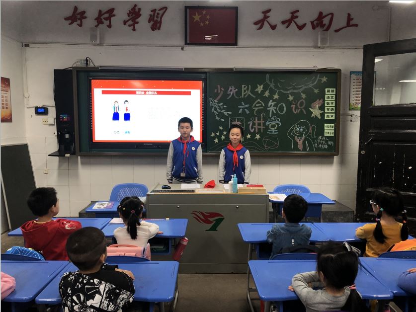 在建队日前夕,为更好地激励一年级孩子们积极向上、努力向队组织靠拢,将红色的火种播撒在小雏鹰们的心中,六年级少先队小干部们带着使命,走进一年级教室,为弟弟妹妹们开设少先队知识大课堂,精彩开讲。少先队“十知道”大闯关、“六知六会我能行”,丰富多彩的队前教育让一年级孩子们对少先队组织充满了无限向往。