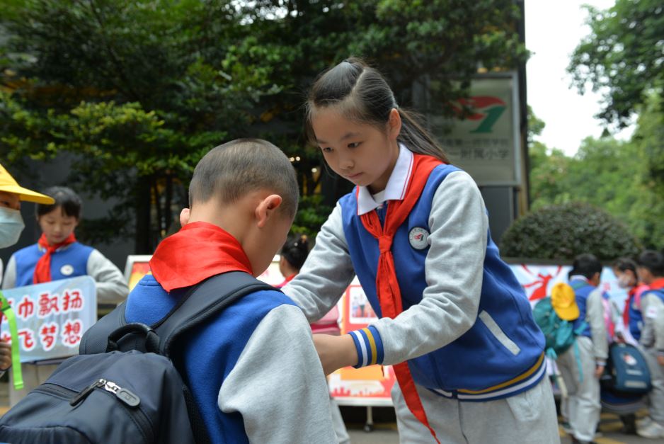 辅导员、礼仪队员们悉心地指导低年级队员们整理着领巾,以身示范着朝气蓬勃的附小少年该如何从点滴的细节努力起。一抹抹温暖微笑,一声声真诚问候,一个个庄严队礼,让这个属于全体少先队员的节日的清晨充满着浓浓温情。