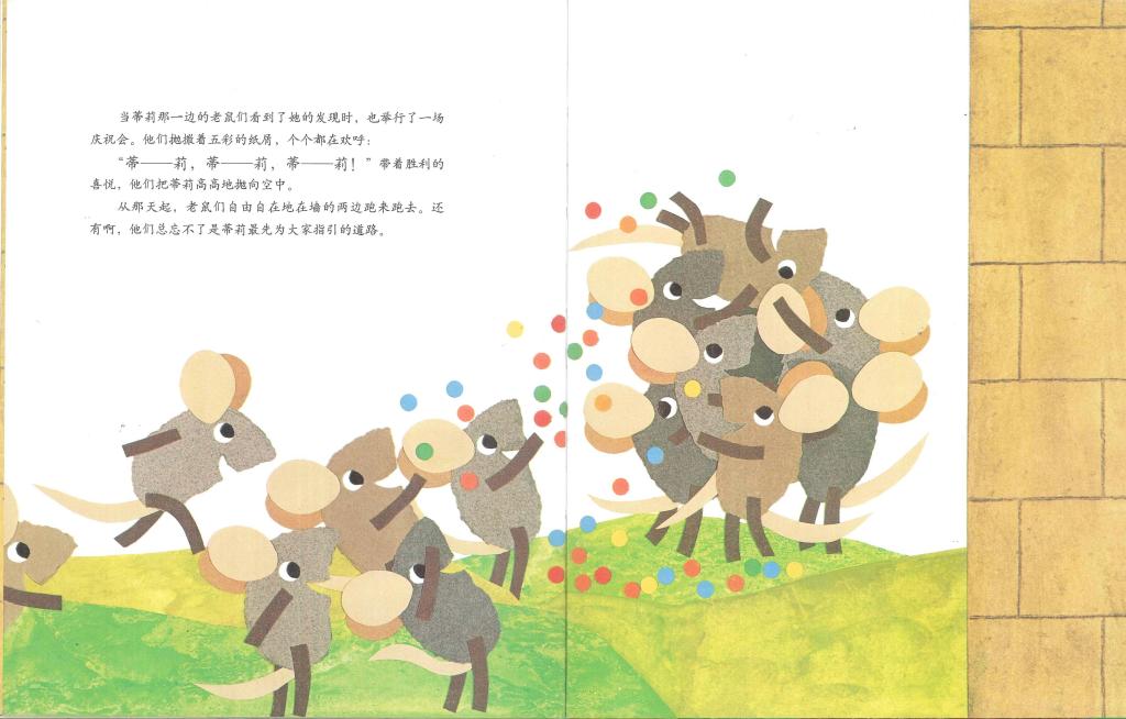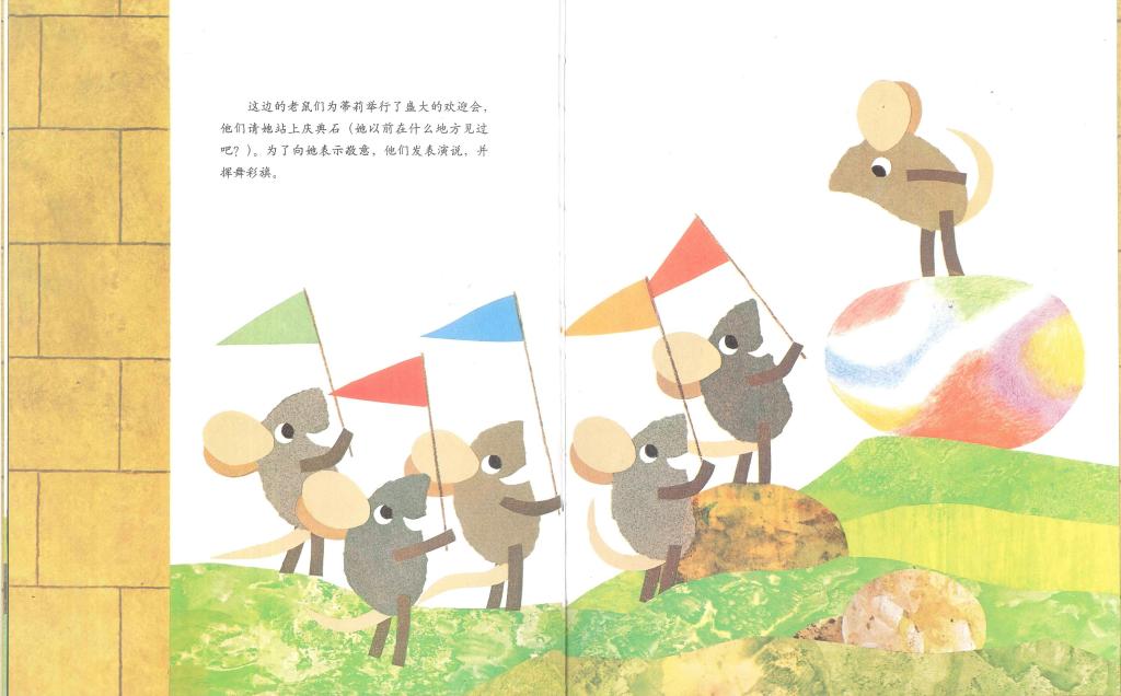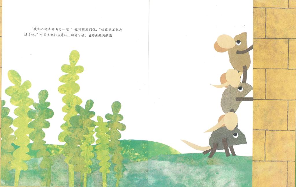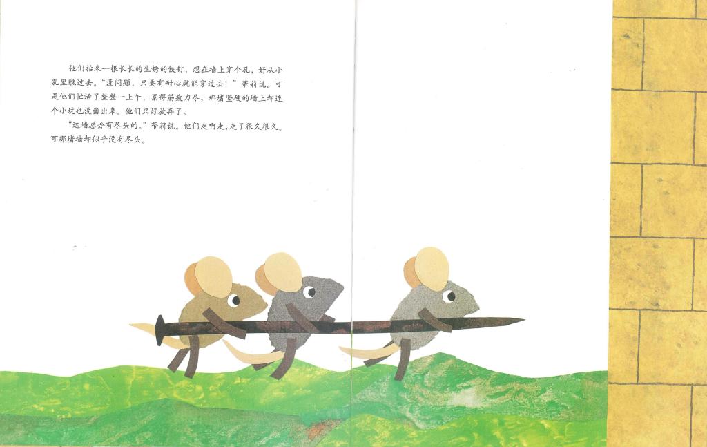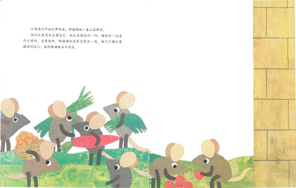 从老鼠们开始记事时起,那堵墙就一直立在那里。他们从来没去注意过它,也从没想过问一问,墙的另一边是什么样的。只有年纪最轻的那只小老鼠蒂莉,总是琢磨着墙的另一边到底有一个怎样的世界,并下定决心一定要去那一边看看。她带领着朋友们往上爬,用铁钉钻,沿着墙向尽头走,可是都没有成功。后来,蒂莉受到蚯蚓的启发,想到了一个好办法。就这样,蒂莉终于看到了墙那边的世界……